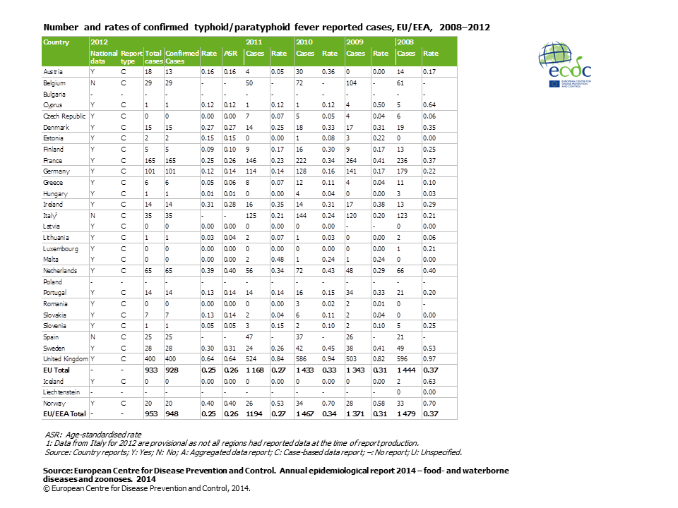 Number and rates of confirmed typhoid/paratyphoid fever reported cases, EU/EEA, 2008–2012