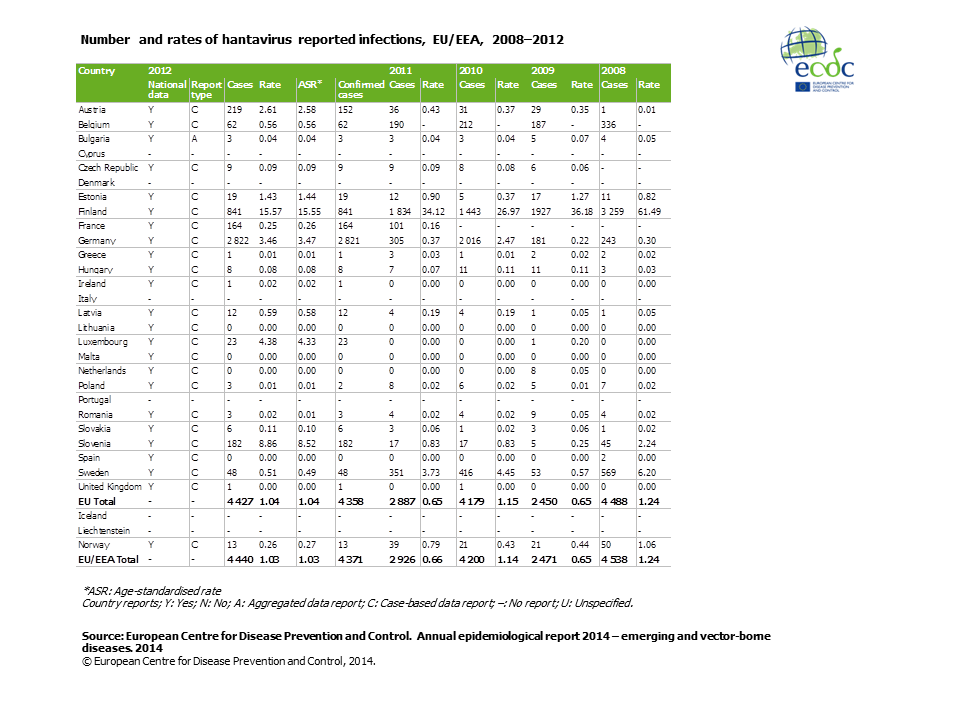 Number and rates of hantavirus reported infections, EU/EEA, 2008–2012