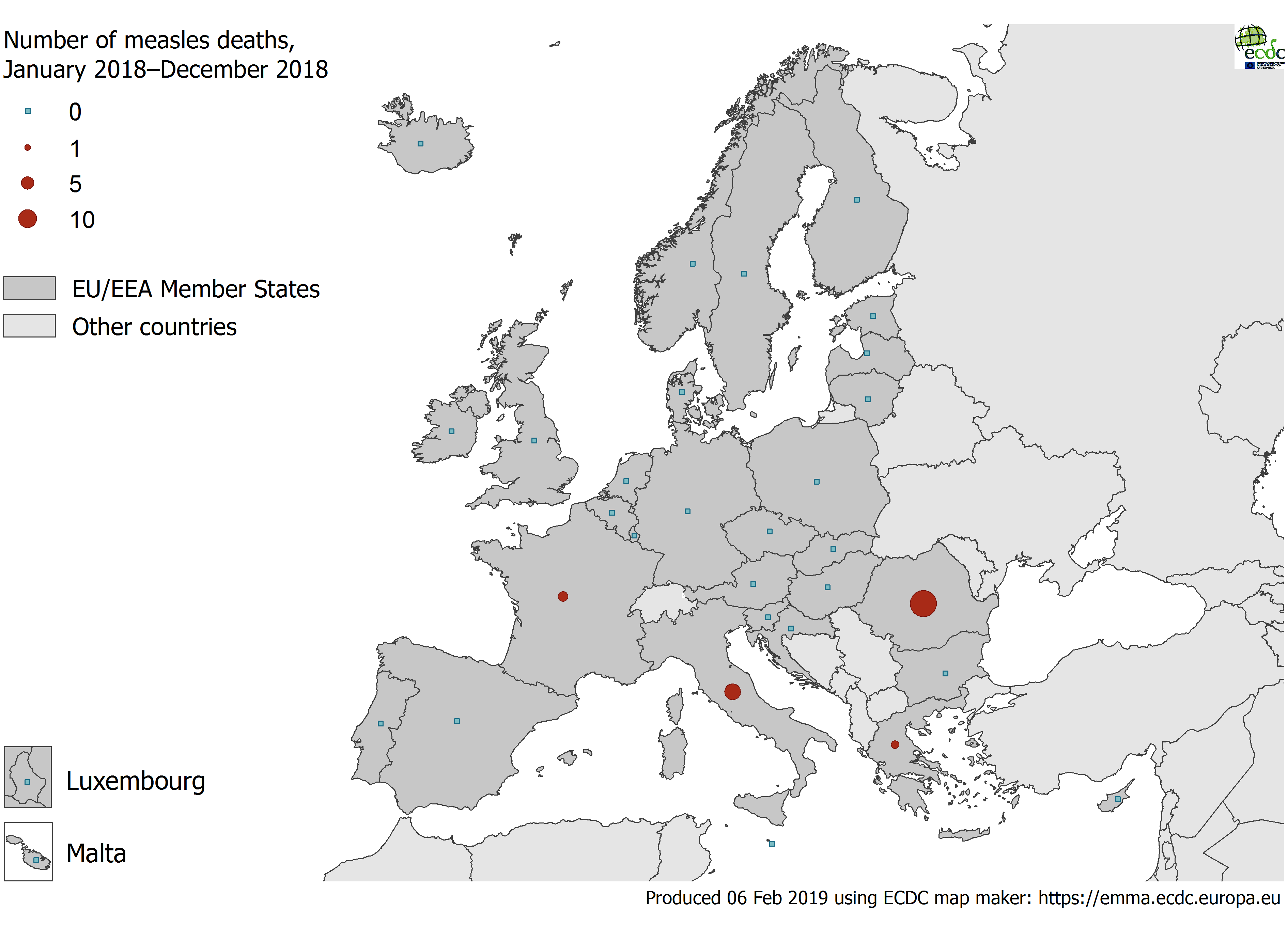 Number of measles deaths by country, EU/EEA, 1 January 2018 to 31 December 2018 (n=34)