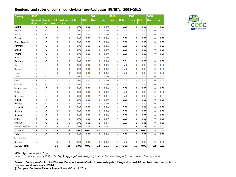 Number and rates of confirmed cholera reported cases, EU/EEA, 2008–2012
