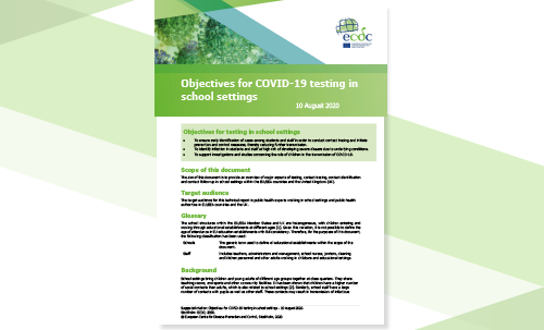The aim of this document is to provide an overview of major aspects of testing, contact tracing, contact identification and contact follow-up in school settings within the EU/EEA countries and the United Kingdom (UK).