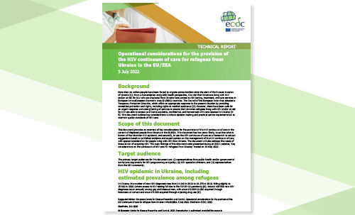 This document provides an overview of key considerations for the provision of the HIV continuum of care in the context of displaced people from Ukraine in the EU/EEA. This document has two aims: firstly, to outline what is known of the Ukrainian HIV epidemic, and secondly, to use the HIV continuum of care as a framework to set out suggestions based on published evidence and expert opinion on the management of the HIV continuum of care, with special consideration for people living with HIV from Ukraine. The document will also address the needs of those at risk of acquiring HIV. The main findings of this document were presented during an ECDC webinar, ‘Key considerations on the continuum of HIV care for refugees from Ukraine,’ hosted on 19 May 2022.
