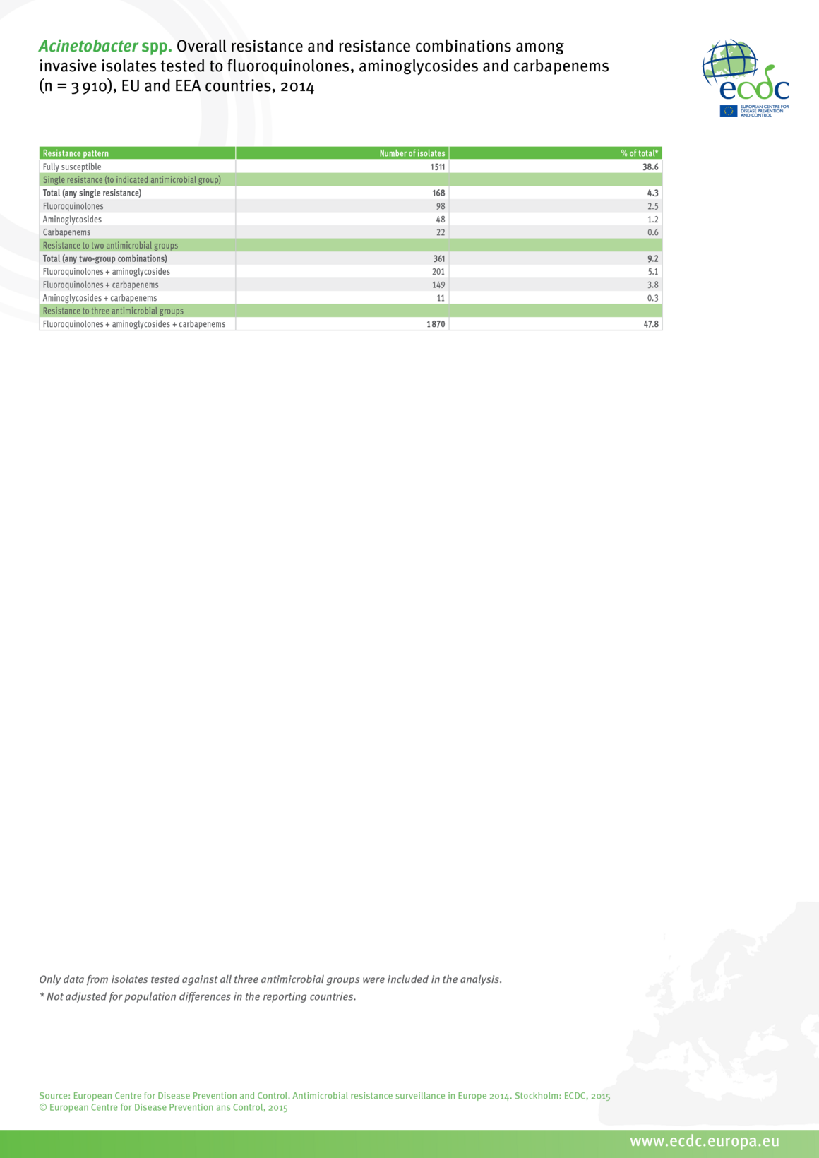 Overall resistance and resistance combinations among invasive isolates tested to fluoroquinolones, aminoglycosides and carbapenems (n=3 910), EU/EEA countries in 2014