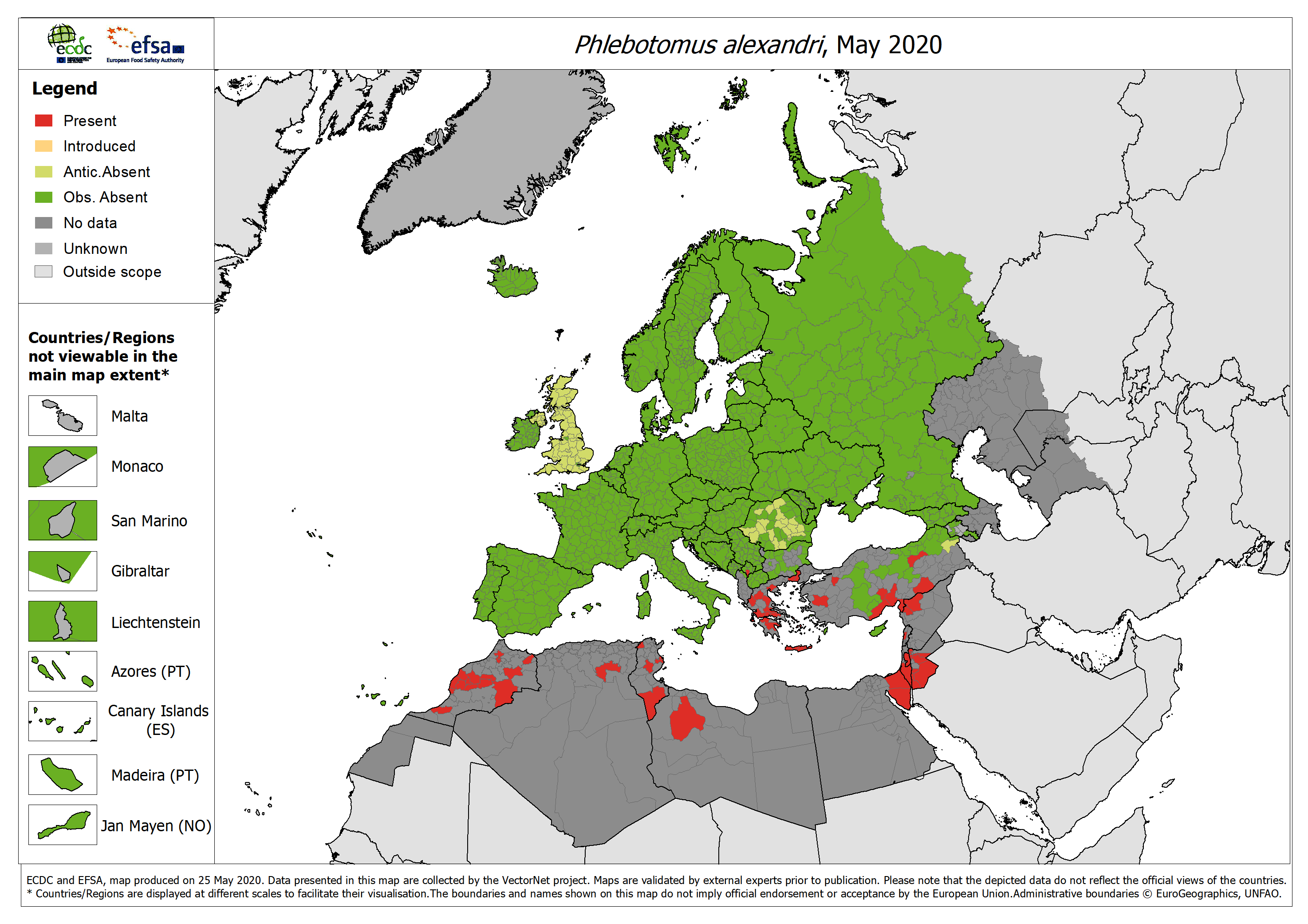 The map shows the current known distribution of Phlebotomus alexandri in Europe at ‘regional’ administrative level, as of May 2020. No new reports were submitted since the previous update (July 2019).