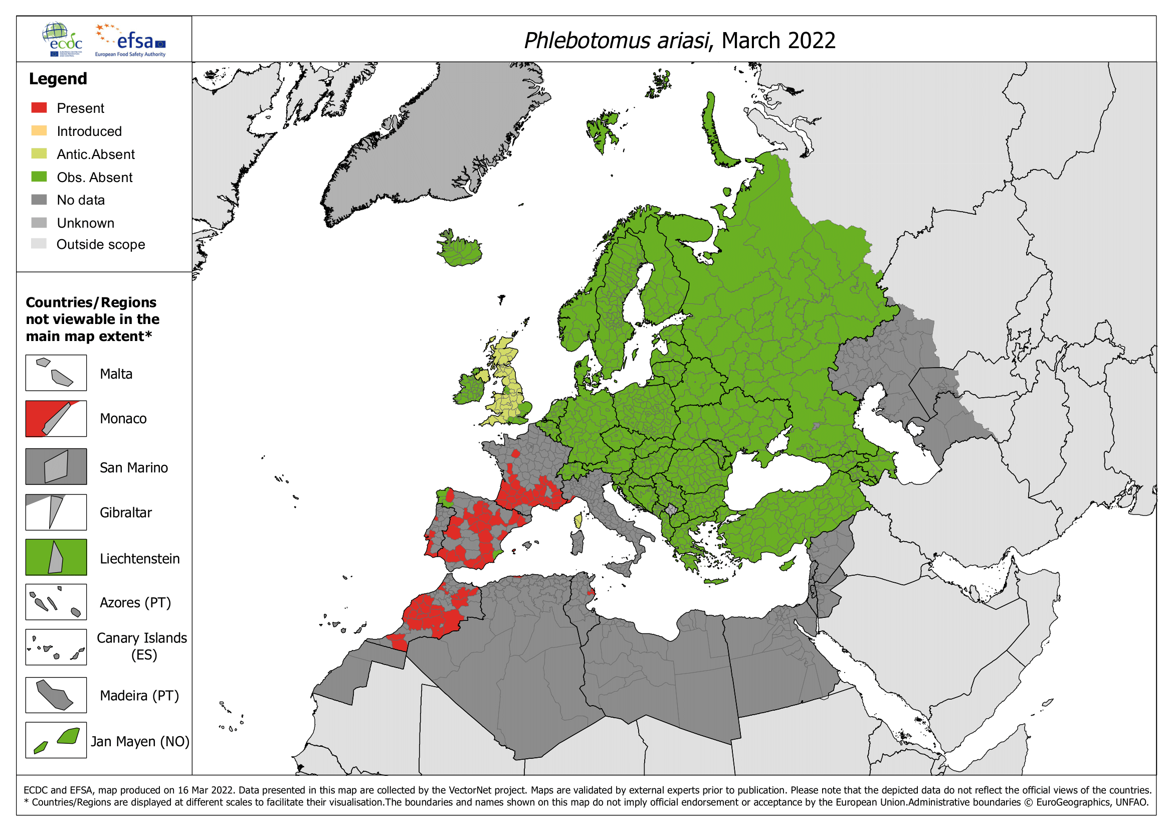Suggested citation: European Centre for Disease Prevention and Control and European Food Safety Authority. Phlebotomine sandflies maps [internet]. Stockholm: ECDC; 2022. Available from: https://ecdc.europa.eu/en/disease-vectors/surveillance-and-disease-data/phlebotomine-maps
