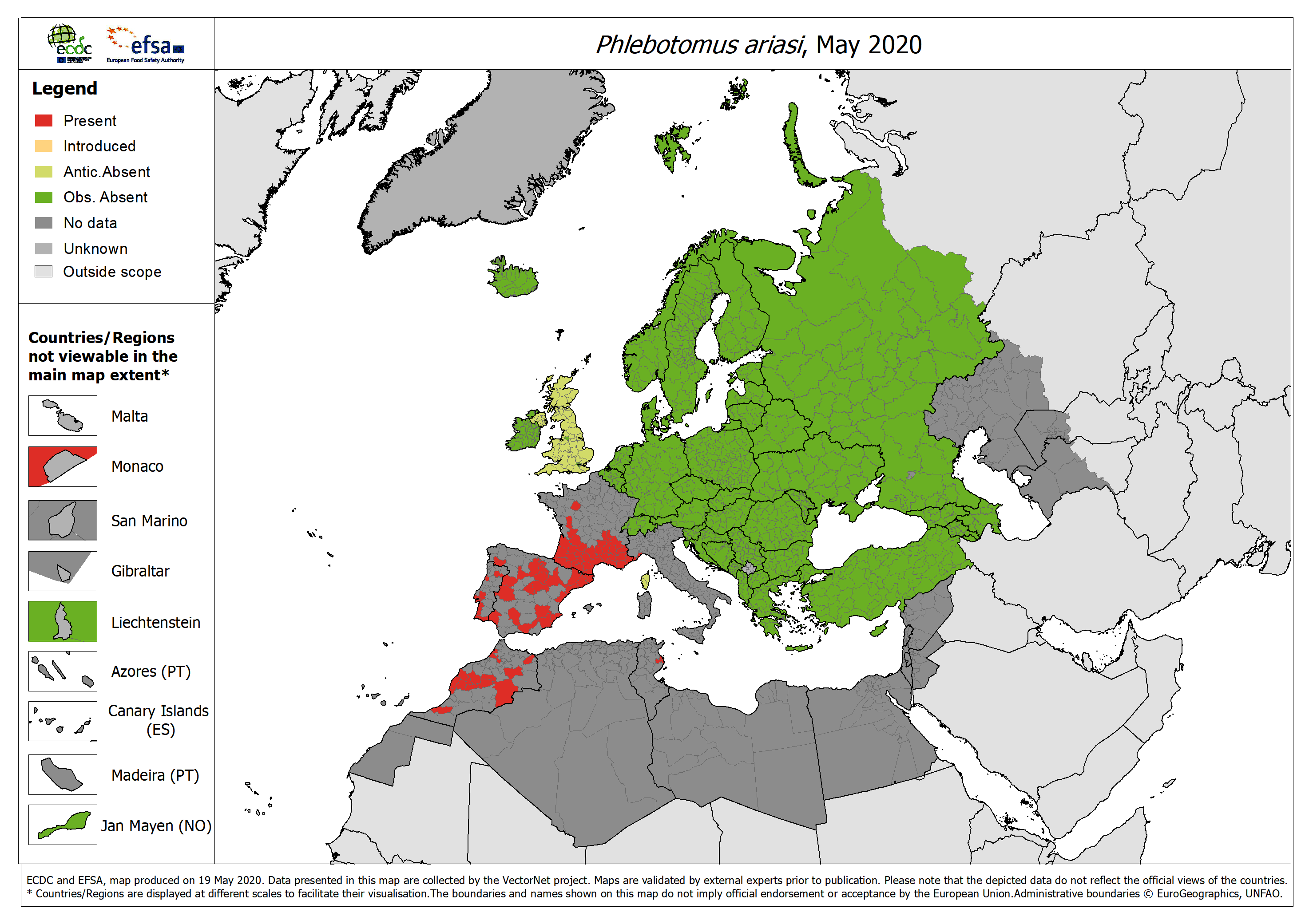 Suggested citation: European Centre for Disease Prevention and Control and European Food Safety Authority. Phlebotomine sandflies maps [internet]. Stockholm: ECDC; 2020. Available from: https://ecdc.europa.eu/en/disease-vectors/surveillance-and-disease-data/phlebotomine-maps