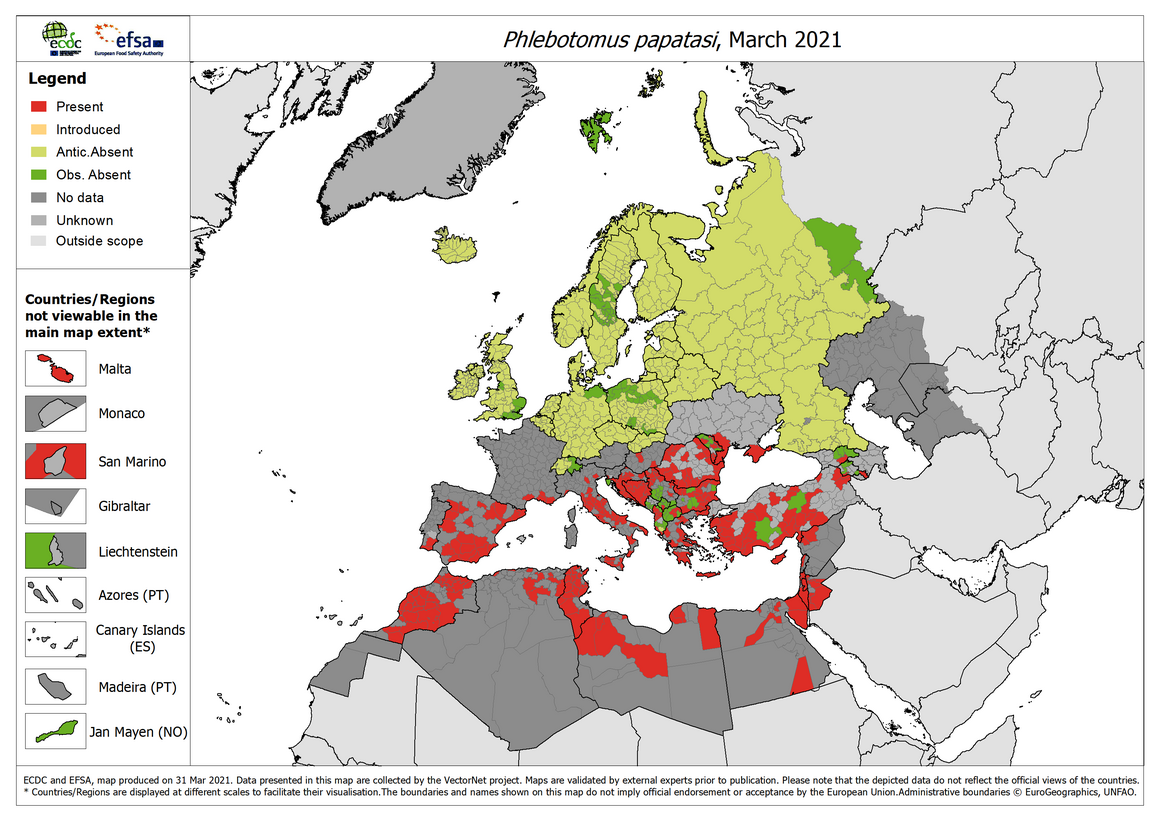 Suggested citation: European Centre for Disease Prevention and Control and European Food Safety Authority. Phlebotomine sandflies maps [internet]. Stockholm: ECDC; 2021. Available from: https://ecdc.europa.eu/en/disease-vectors/surveillance-and-disease-data/phlebotomine-maps