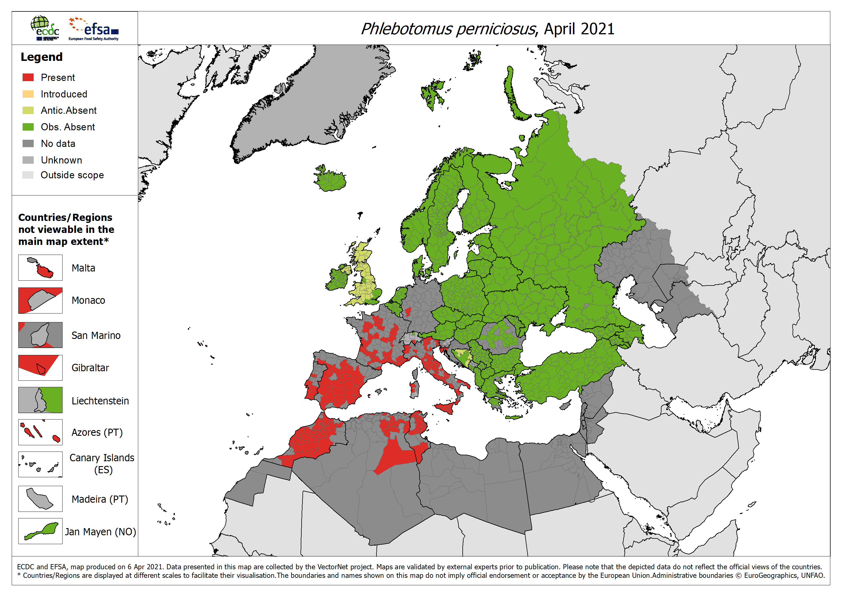 The map shows the current known distribution of Phlebotomus perniciosus in Europe at ‘regional’ administrative level, as of April 2021. 242 new reports were submitted since the previous update (October 2020).