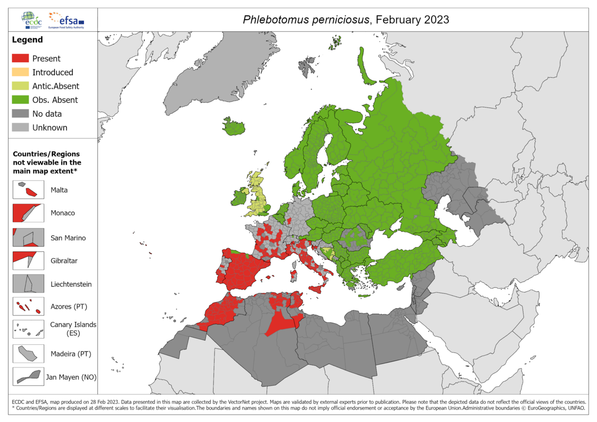 Suggested citation: European Centre for Disease Prevention and Control and European Food Safety Authority. Phlebotomine sandflies maps [internet]. Stockholm: ECDC; 2023. Available from: https://ecdc.europa.eu/en/disease-vectors/surveillance-and-disease-data/phlebotomine-maps