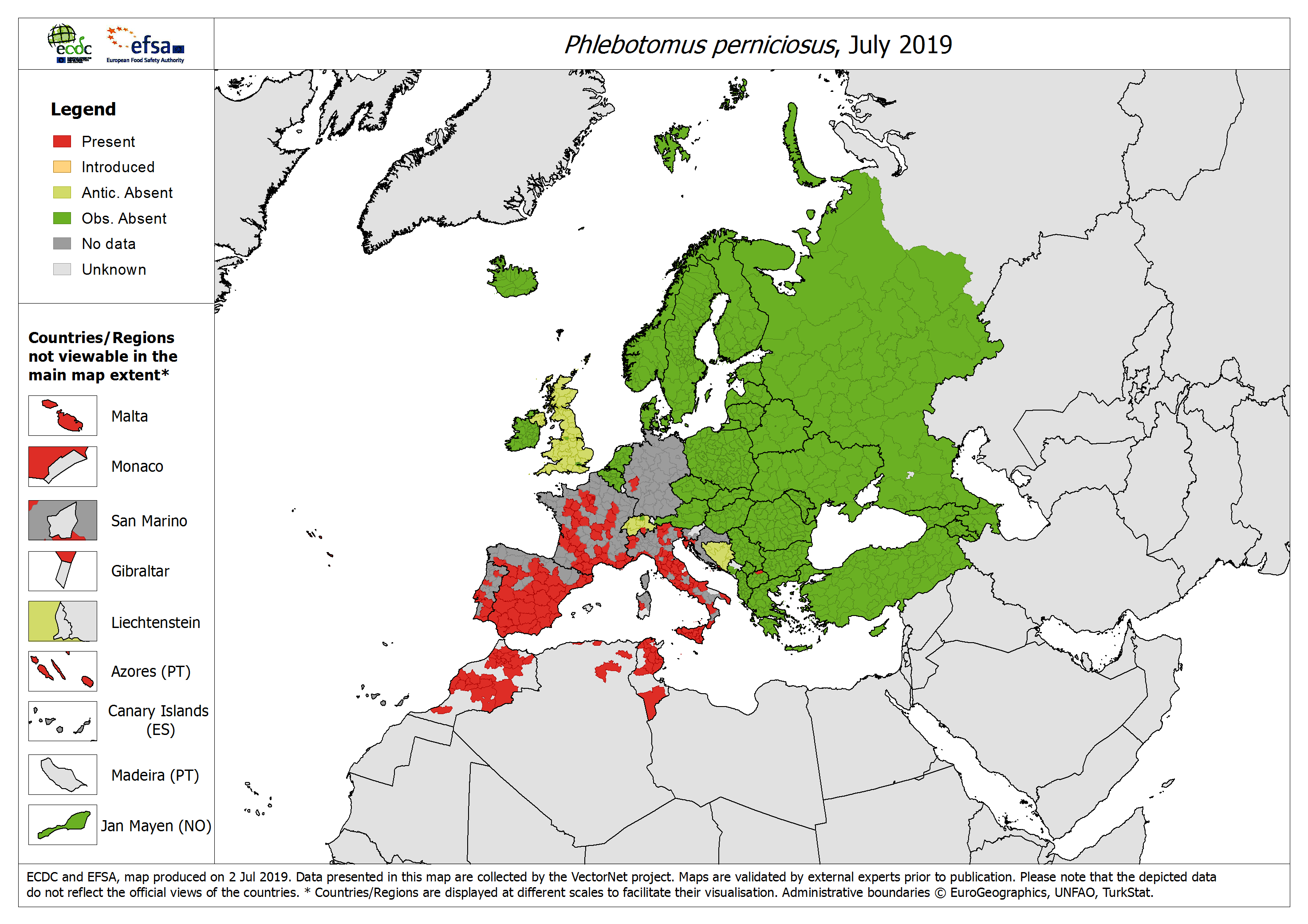 The map shows the current known distribution of Phlebotomus perniciosus in Europe at ‘regional’ administrative level, as of July 2019. No new reports were submitted since the previous update (January 2019).