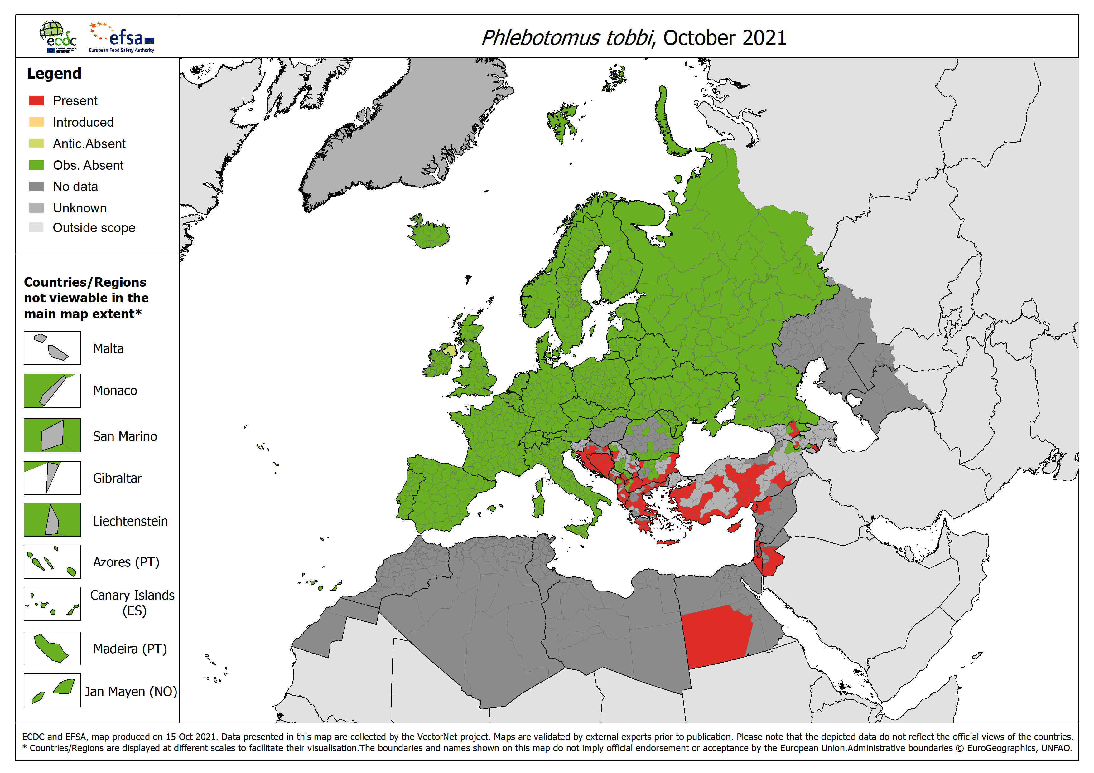 Suggested citation: European Centre for Disease Prevention and Control and European Food Safety Authority. Phlebotomine sandflies maps [internet]. Stockholm: ECDC; 2021. Available from: https://ecdc.europa.eu/en/disease-vectors/surveillance-and-disease-data/phlebotomine-maps