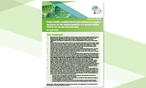 - Mathematical modelling suggests that a second booster roll-out including those aged 60-79 years who are immunocompetent in the EU/EEA is likely to be beneficial, although the best timing for the roll-out depends on the highly uncertain future of COVID-19 incidence. Therefore, continued close epidemiological and vaccine effectiveness monitoring is essential in order to rapidly detect signals of increased SARS-CoV-2 circulation or risk of severe COVID-19 among vaccinated individuals. If such signals emerge, a second booster may be considered for all or some adults between the ages of 60 and 79 years and countries should have plans in place for a rapid deployment of booster doses in this population group.