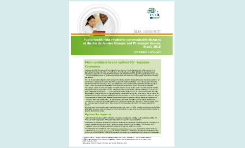 This risk document updates ECDC’s initial assessment of the potential health risks related to communicable diseases and other health threats for European citizens during the 2016 Olympic and Paralympic Summer Games in Rio de Janeiro, Brazil and the public health implications for European countries after travellers return to Europe. In addition, the document assesses the risk of disease importation from Europe to Brazil.