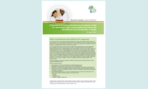 This rapid risk assessment considers the risk to the EU of an outbreak of invasive meningococcal disease in the UK and Sweden associated with the 23rd World Scout Jamboree in Japan. The two countries have reported eight cases (five confirmed and three suspected cases) of IMD to date in scouts and their contacts who have returned from the Jamboree, which took place in Japan from 28 July to August.
