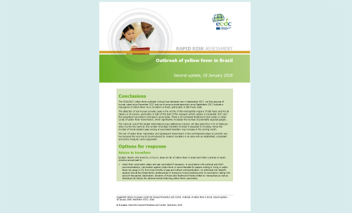 This is the second update of a rapid risk assessment originally produced on 25 January 2017 and updated on 13 April 2017. It assesses the risk to EU/EEA countries and citizens associated with the ongoing outbreak of yellow fever in Brazil. It was triggered by the evolution of the epidemic in São Paulo state and reports of an imported case into the EU/EEA from Brazil.