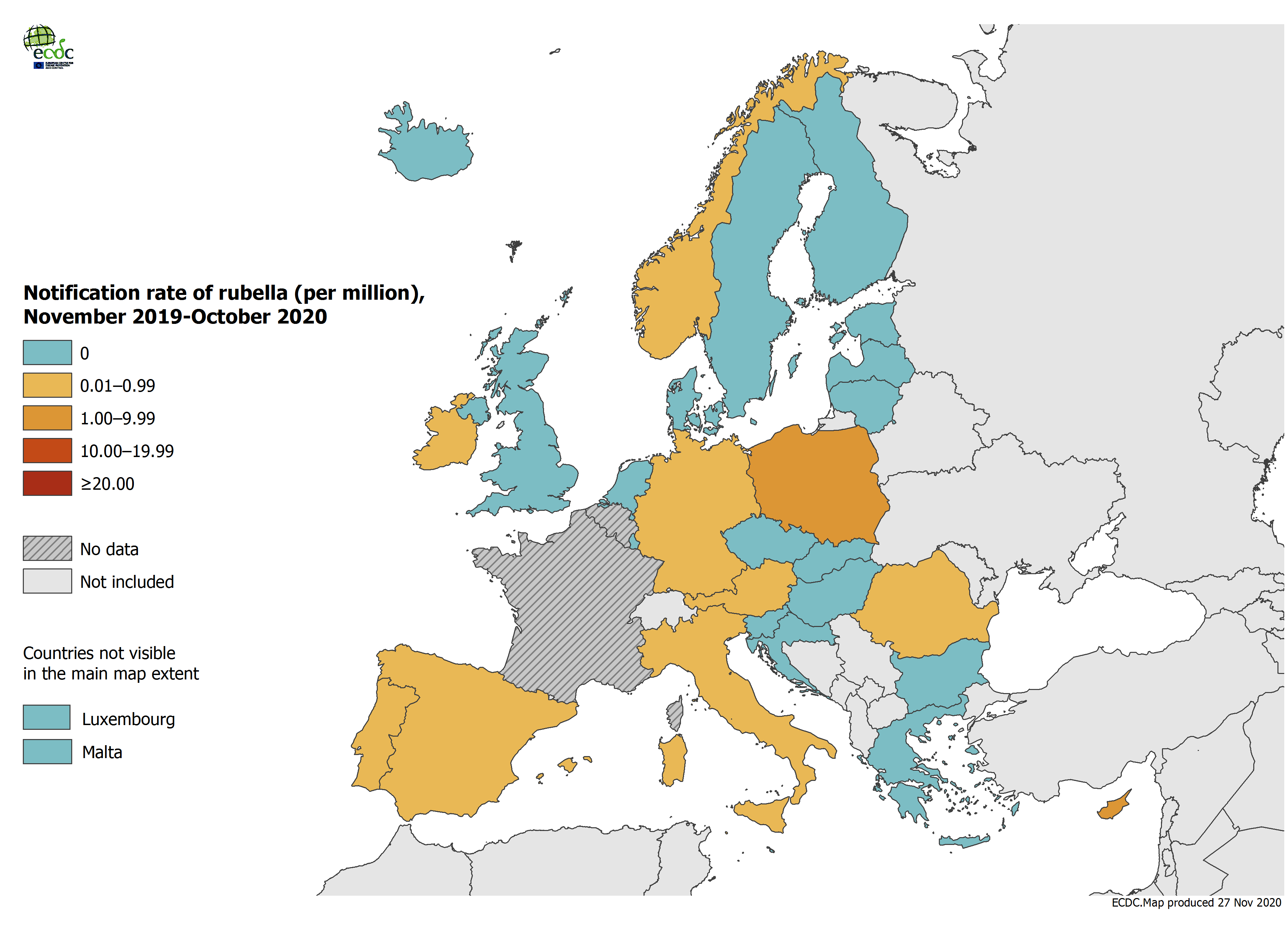 Rubella notification rate per million population by country, EU/EEA and the UK, November 2019 - October 2020