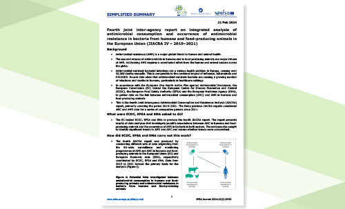 This is a summary of the fourth joint inter-agency report on integrated analysis of antimicrobial consumption and occurrence of antimicrobial resistance in bacteria from humans and food-producing animals in the European Union (JIACRA IV – 2019–2021).
