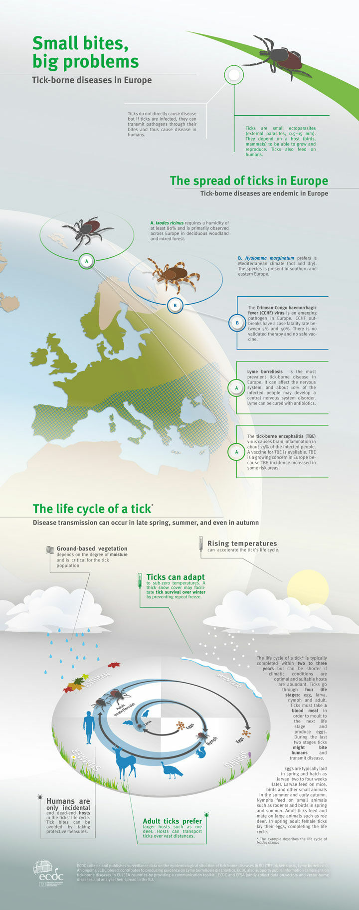 What are the different species of ticks in Europe, where are they found and what diseases can they transmit? Why does disease transmission occurs in spring and summer? What is a tick's life cycle?
