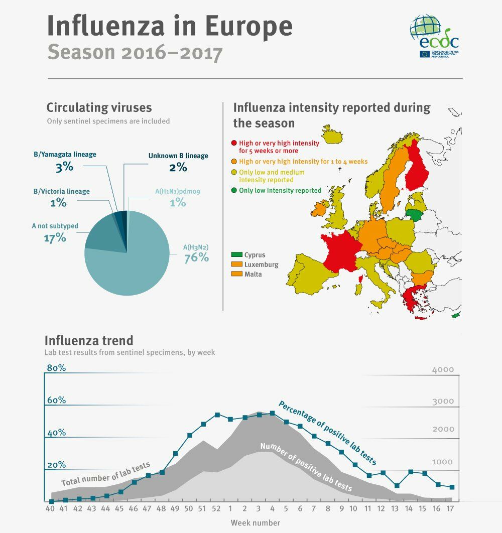 The influenza season 2016–2017 has now come to an end in Europe. In week 17/2017, all EU/EEA countries reported low influenza activity and the positivity rate (proportion of influenza virus positives among all tested specimens) falling below the 10% benchmark to 9.9%. For the previous six weeks, almost all EU/EEA countries had reported low influenza activity.