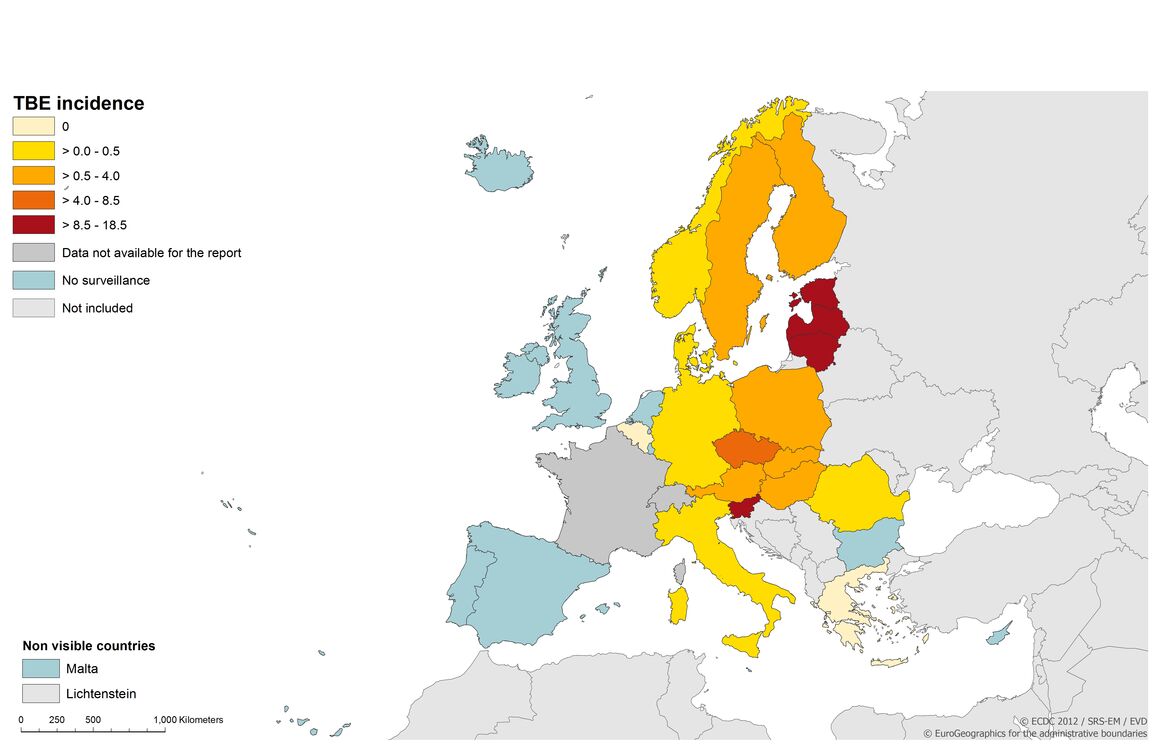 TBE Key risk areas: TBE average annual incidence rate per 100 000 inhabitants in the EU/EFTA at country level