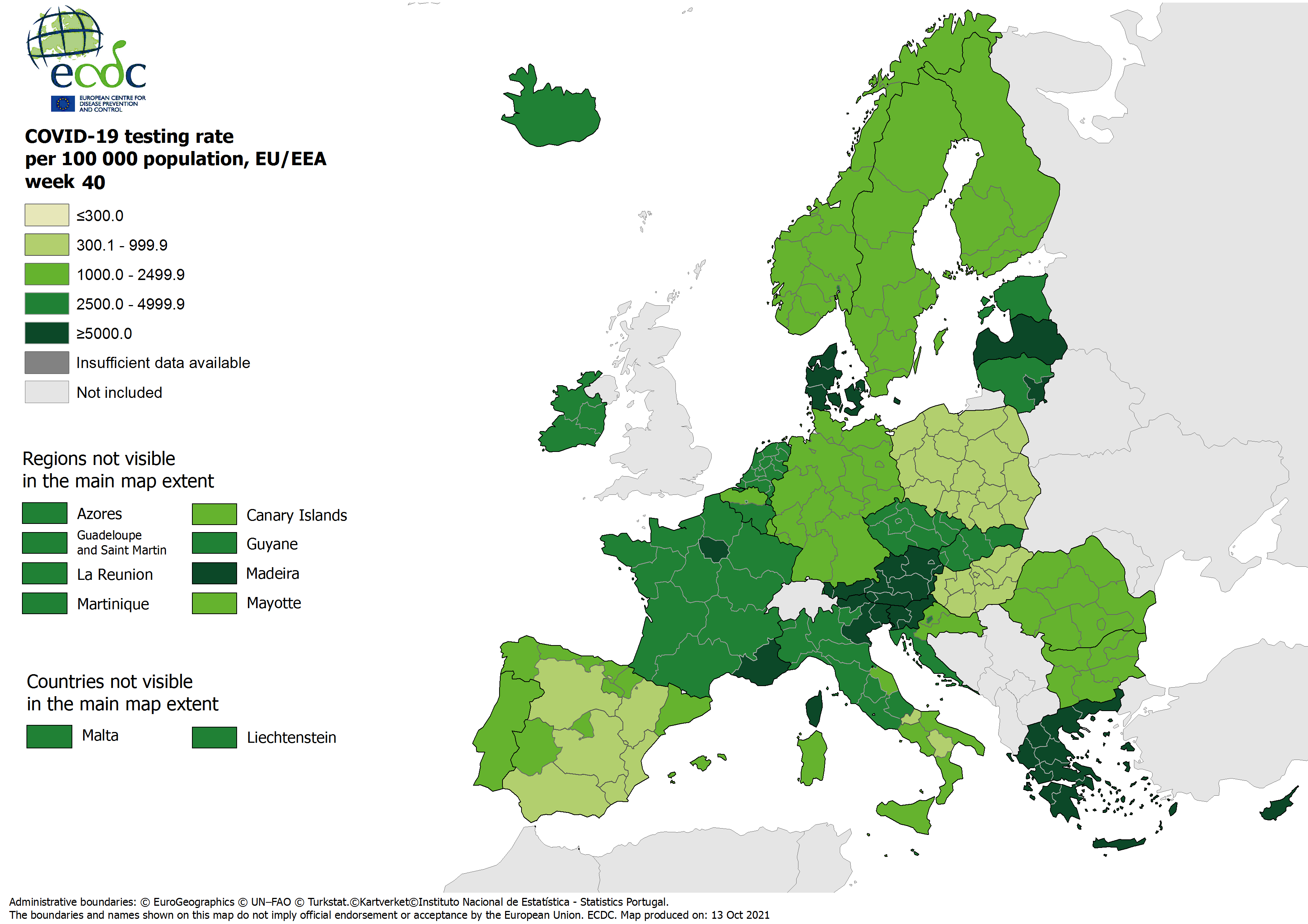Testing rates per 100 000 inhabitants, updated 14 October 2021, week 40