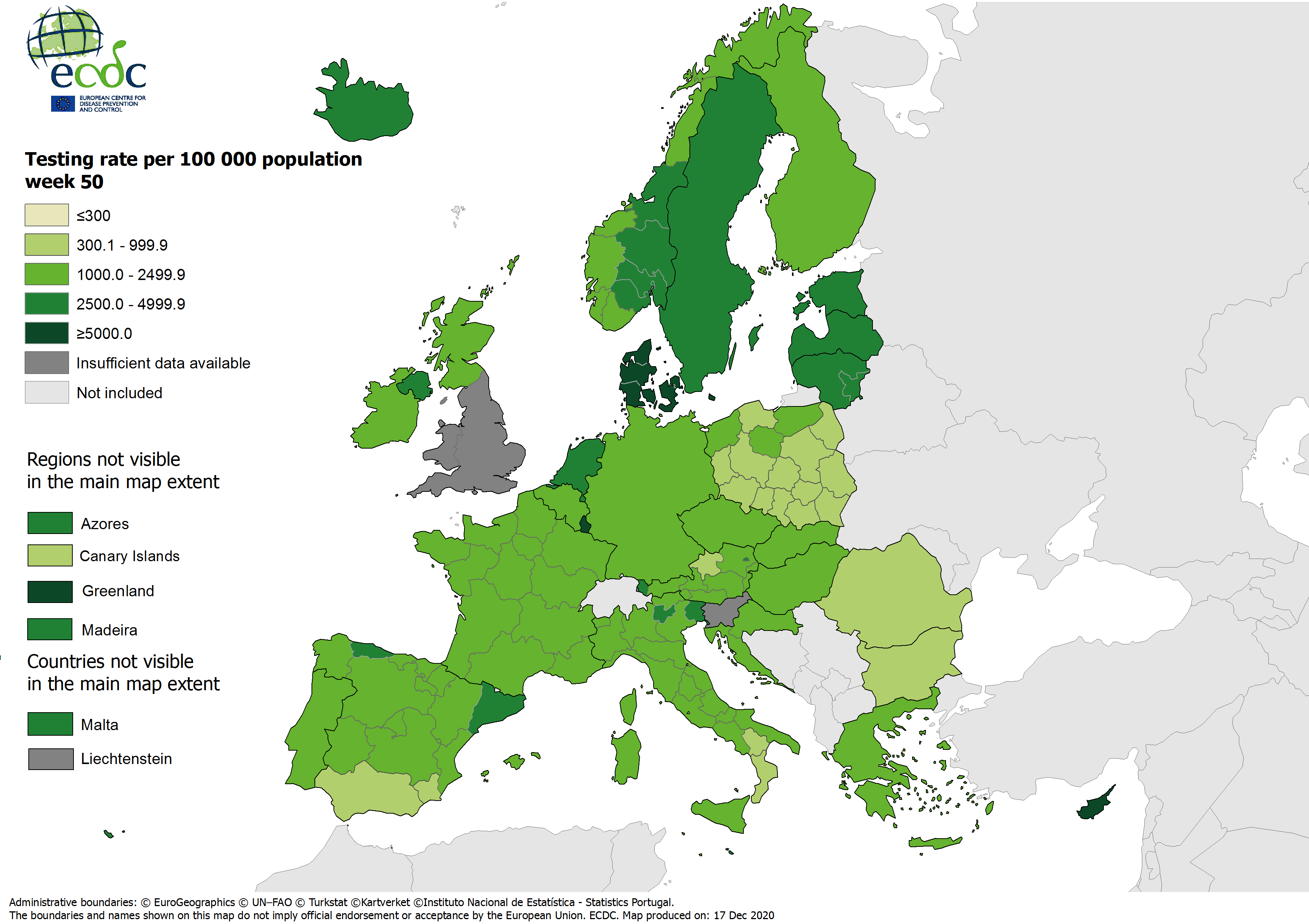 Testing rates per 100 000 inhabitants, updated 17 December 2020, week 50