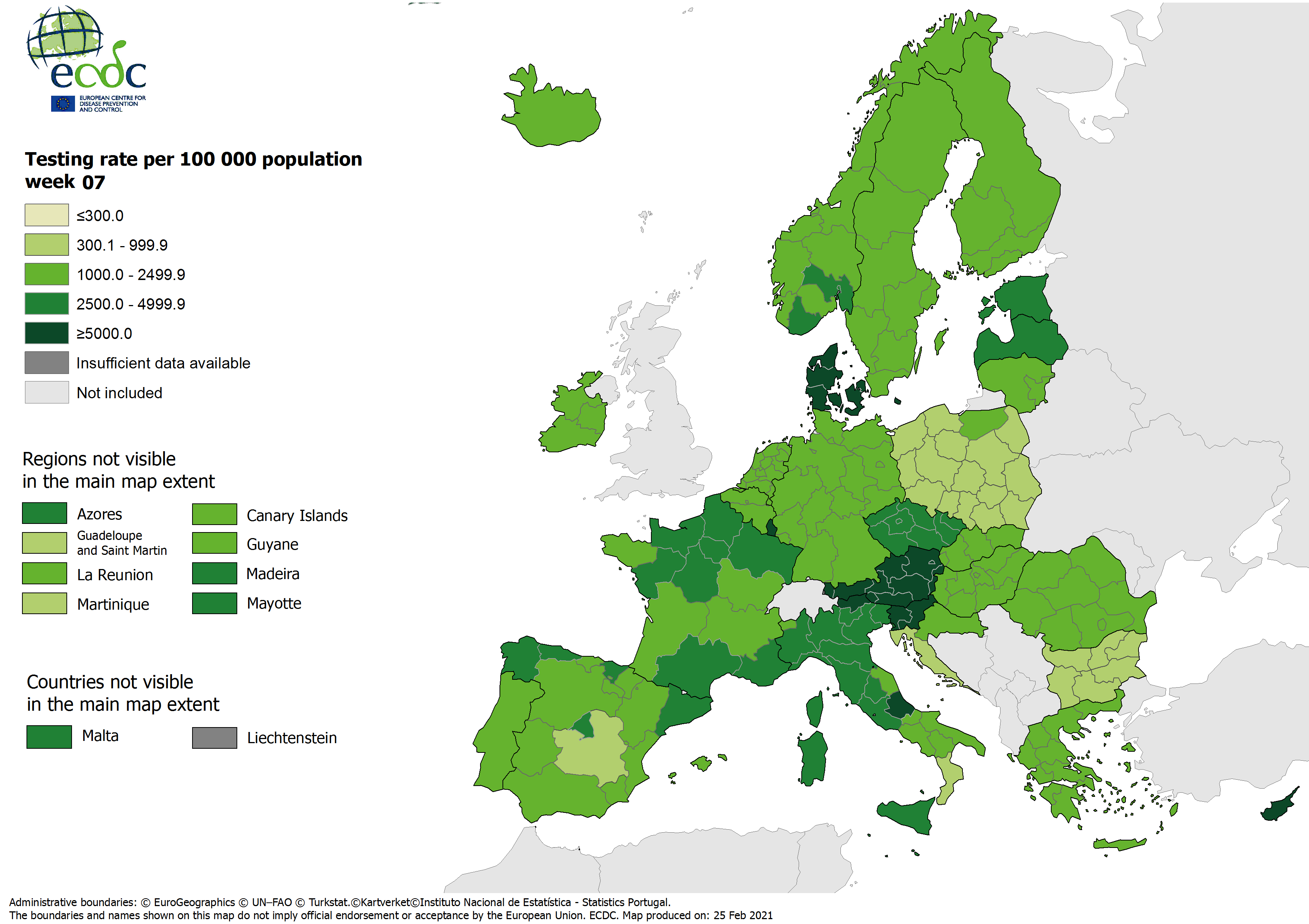 Testing rates per 100 000 inhabitants, updated 25 February 2021, week 7