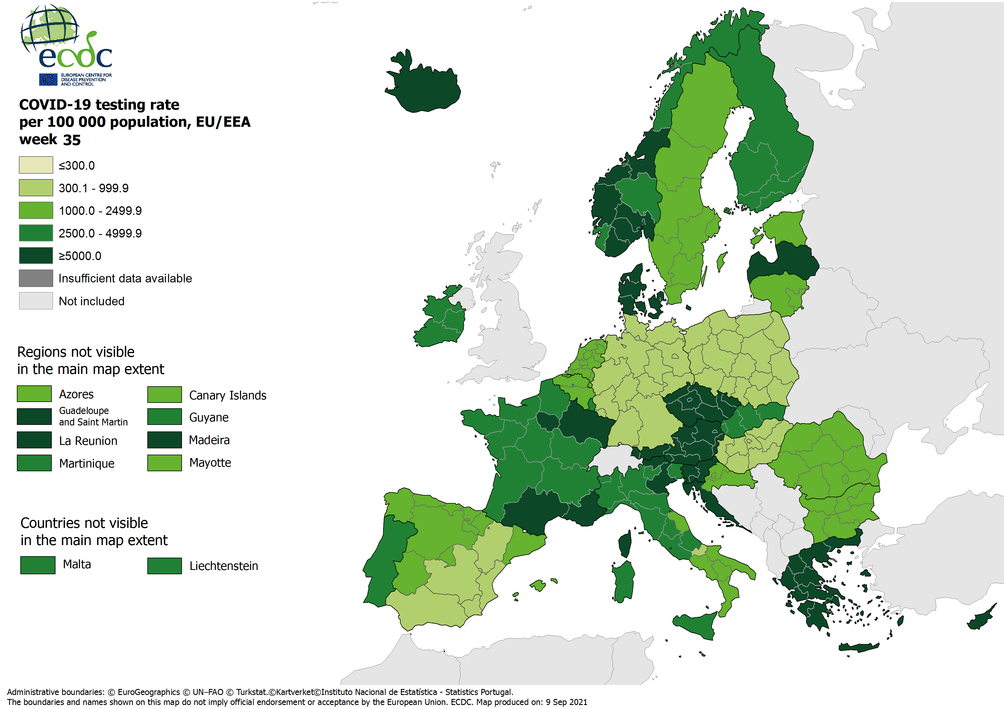 Testing rates per 100 000 inhabitants, updated 9 September 2021, week 35