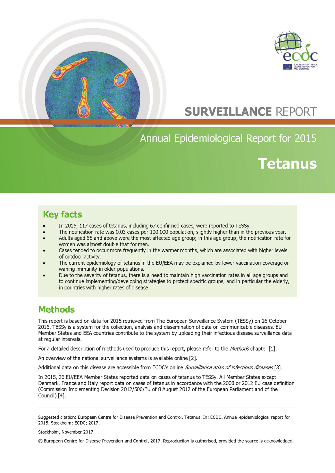 In 2015, 117 cases of tetanus, including 67 confirmed cases, were reported to TESSy. The notification rate was 0.03 cases per 100 000 population, slightly higher than in the previous year. Adults aged 65 and above were the most affected age group; in this age group, the notification rate for women was almost double that for men. Cases tended to occur more frequently in the warmer months, which are associated with higher levels of outdoor activity. The current epidemiology of tetanus in the EU/EEA may be explained by lower vaccination coverage or waning immunity in older populations. Due to the severity of tetanus, there is a need to maintain high vaccination rates in all age groups and to continue implementing/developing strategies to protect specific groups, and in particular the elderly, in countries with higher rates of disease.