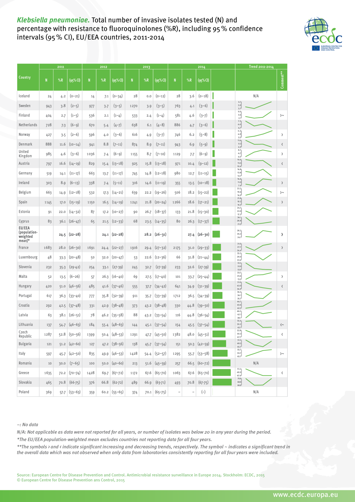 Total number of invasive isolates tested (N) and percentage resistant to fluoroquinolones (%R), including 95% confidence intervals (95% CI), EU/EEA countries, 2011-2014