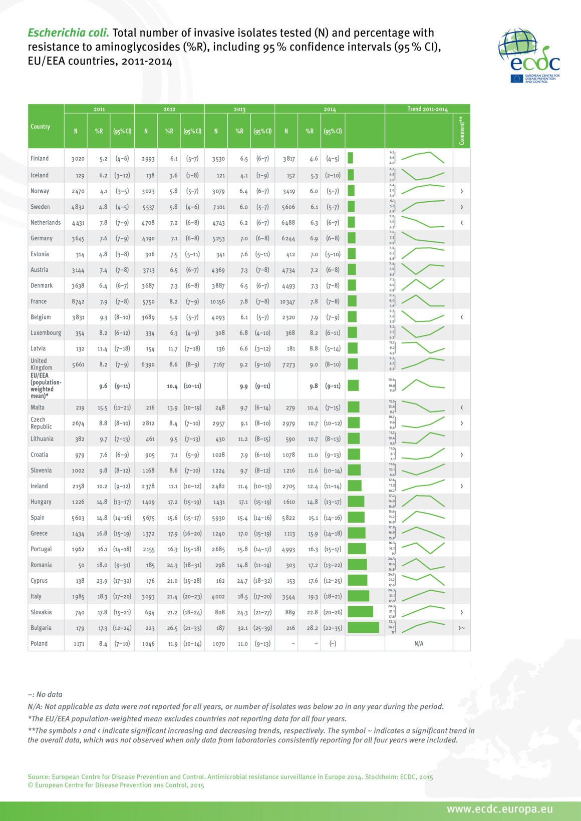 Total number of invasive isolates tested (N) and percentage resistant to aminoglycosides (%R), including 95% confidence intervals (95% CI), EU/EEA countries, 2011-2014