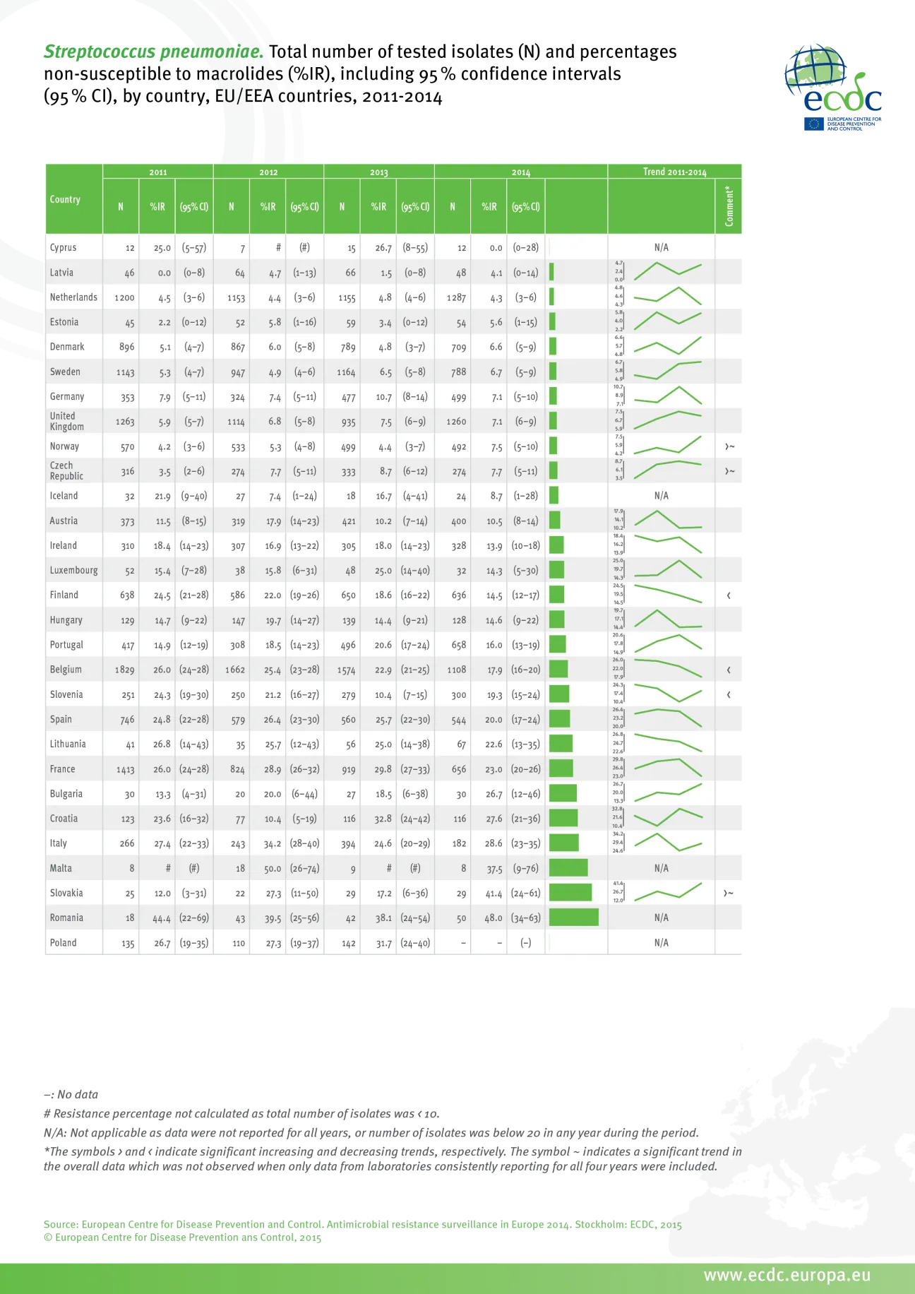 Total number of tested isolates (N) and percentages non-susceptible to macrolides (%IR) , including 95% confidence intervals (95% CI), by country, EU/EEA countries, 2011-2014