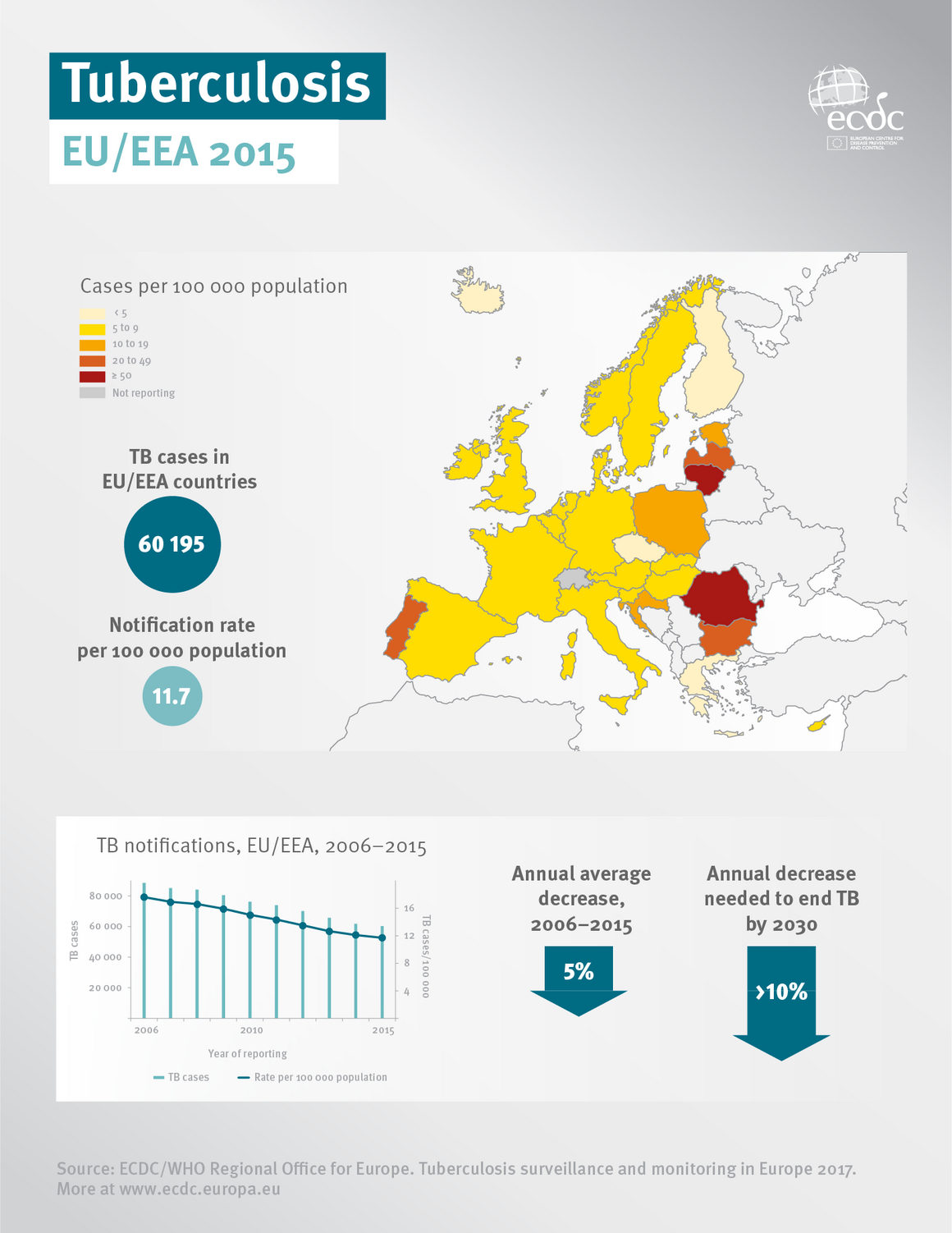 This infographic shows the tuberculosis situation in Europe based on data from the 2017 surveillance report (2015 data).