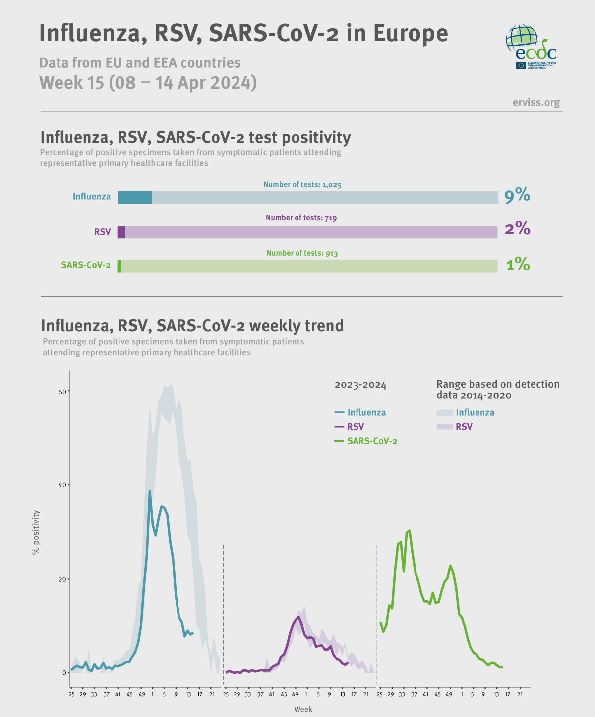 Influenza, SARS-CoV-2 and RSV activity in EU/EEA Member States continue to decrease or remain stable at low levels. Cases, including severe infections, can still occur and it therefore remains essential to continue testing patients presenting with severe acute respiratory symptoms in order to guide treatment and inform epidemiological assessments.