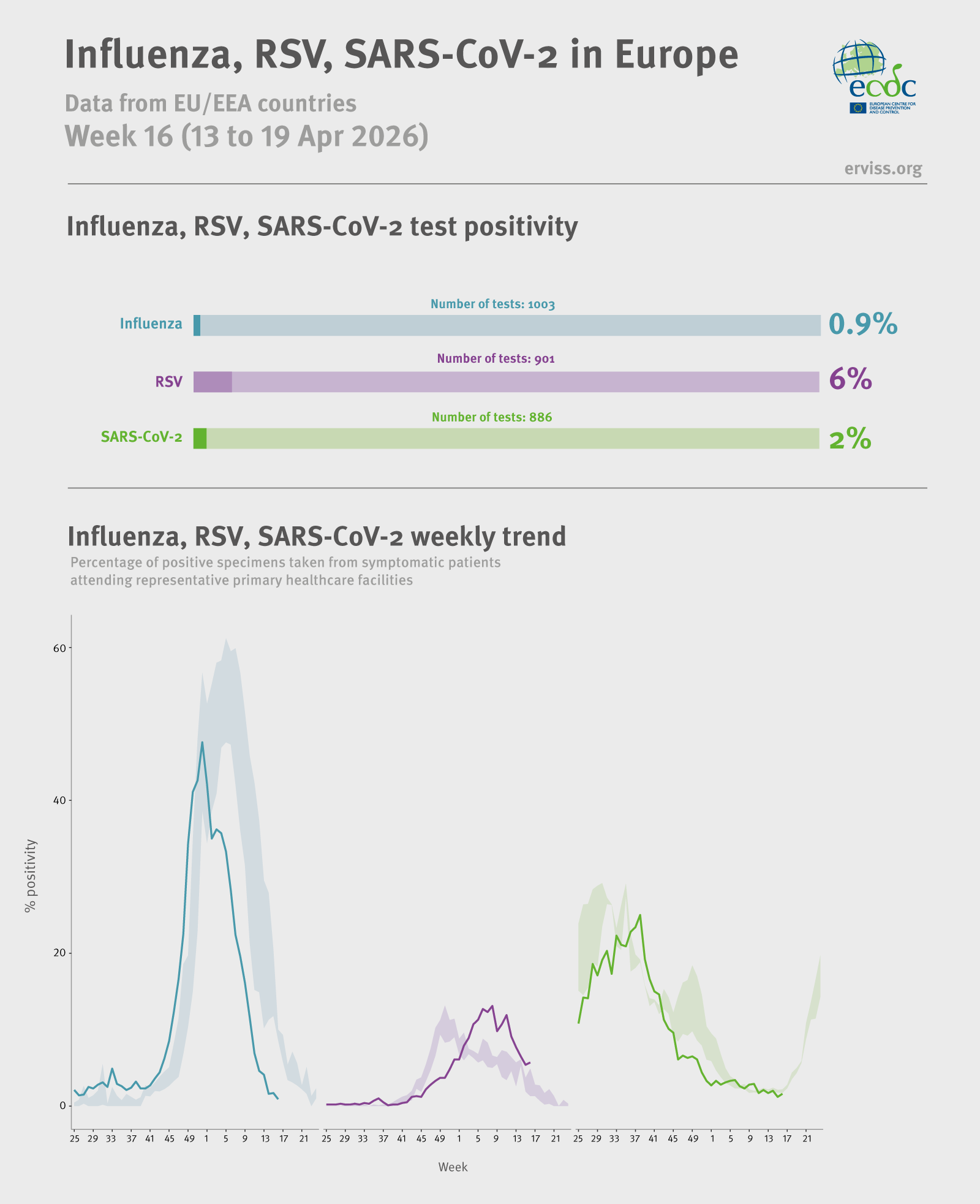 • RSV: moderate activity but decreasing, with the seasonal peak already passed in most countries.