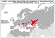 The map shows the reported cases of West Nile fever in Europe during the transmission season 2016. 210 cases of West Nile fever in humans have been reported in the EU Member States and 267 cases in the neighbouring countries, since the beginning of the 2016 transmission season. During the transmission season, ECDC publishes updates on the spatial distribution of human cases of West Nile fever in the European Union and neighbouring countries in its online atlas.