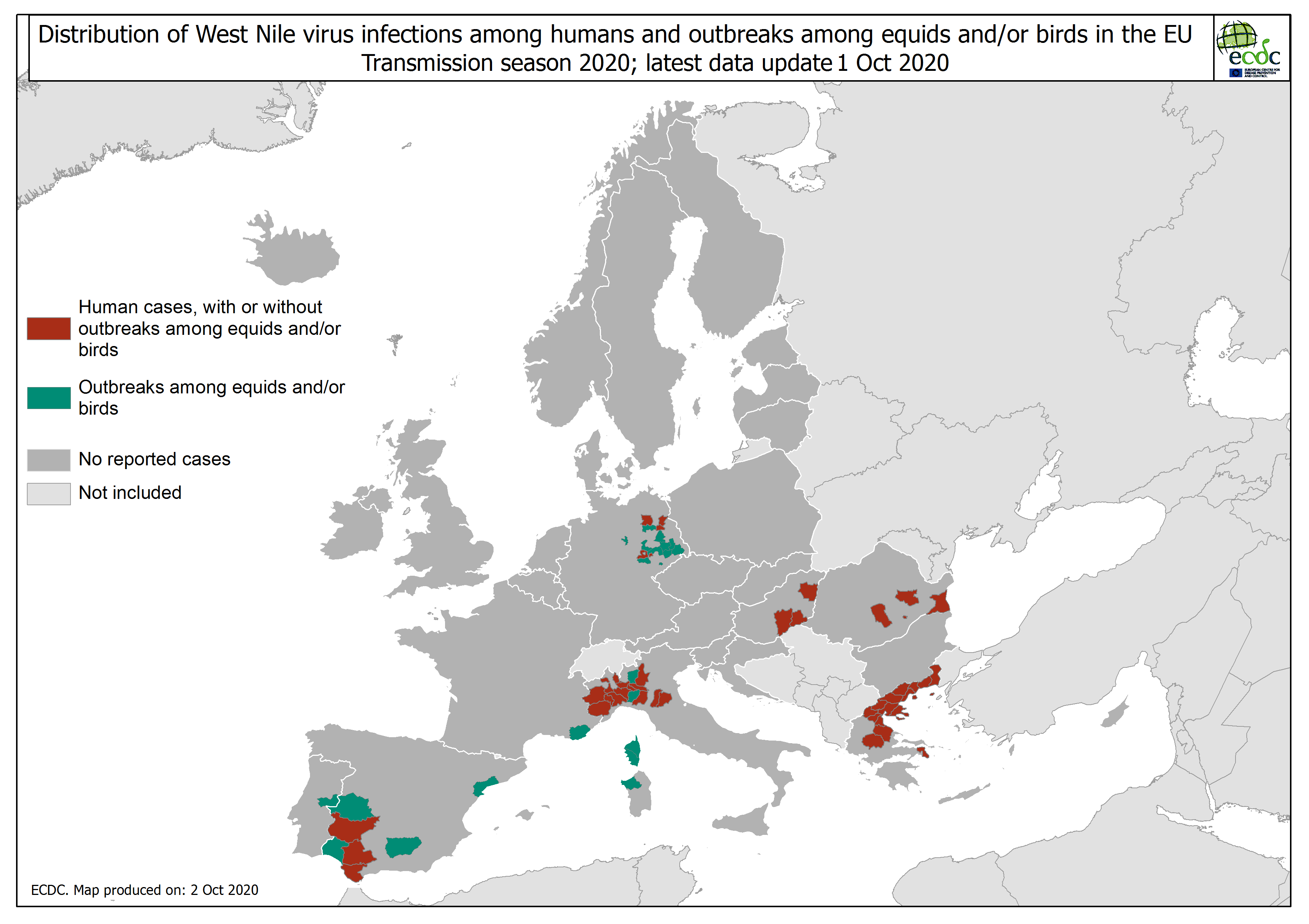 West Nile virus in Europe in 2020 - infections among humans and outbreaks among equids and/or birds, updated 1 October 2020