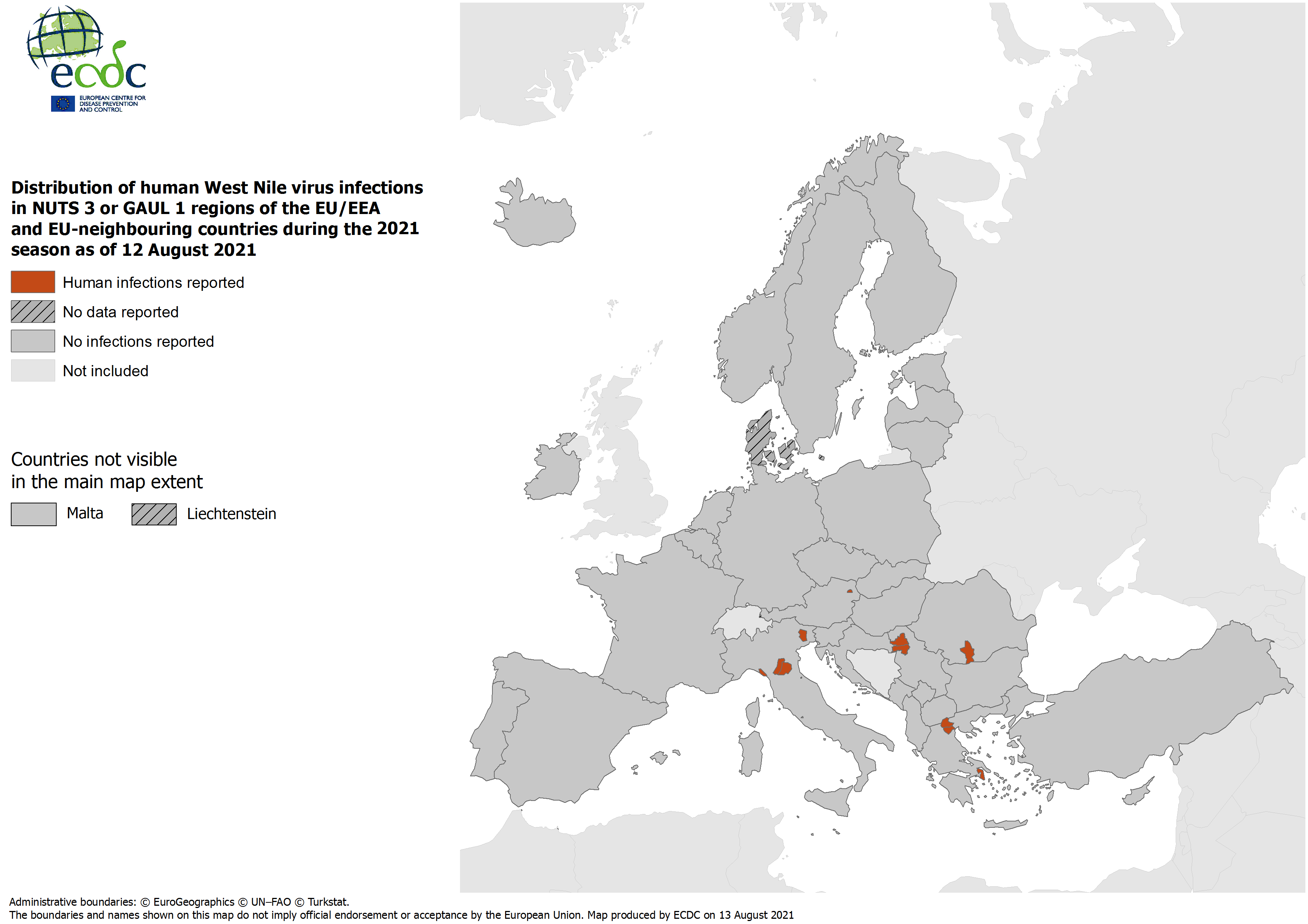 Between 6 and 12 August 2021, European Union (EU) and European Economic Area (EEA) countries reported 12 human cases of West Nile virus (WNV) infection and no deaths related to WNV infections. Cases were reported by Greece (5), Italy (4), Austria (2) and Romania (1). EU-neighbouring countries reported 2 fatal human cases of WNV infection in Serbia.