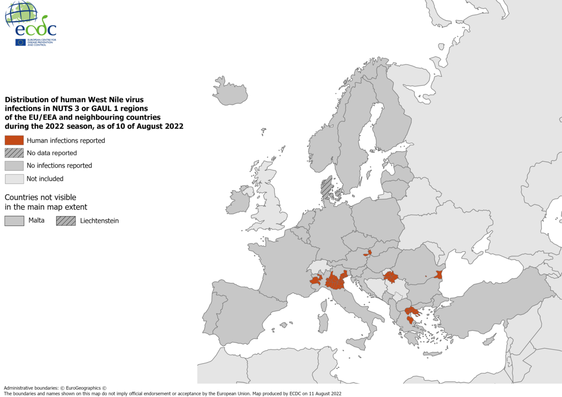 Since last week’s update, and as of 10 August 2022, European Union (EU) and European Economic Area (EEA) countries reported 67 human cases of West Nile virus (WNV) infection and three deaths related to WNV infections. Cases were reported by Italy (50), Greece (15) and Austria (2). Deaths were reported by Italy (3). EU-neighbouring countries reported 11 human cases of WNV infection in Serbia (11) and deaths (2) related to WNV infections in Serbia.