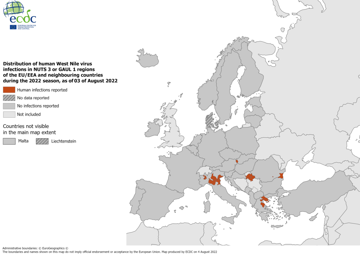 Since last week’s update, and as of 3 August 2022, European Union (EU) and European Economic Area (EEA) countries reported 66 human cases of West Nile virus (WNV) infection and 2 deaths related to WNV infections. Cases were reported by Italy (52), Greece (12) and Romania (2). Deaths were reported by Italy (2). EU-neighbouring countries reported 7 human cases of WNV infection in Serbia (7) and one death related to WNV infections in Serbia (1).