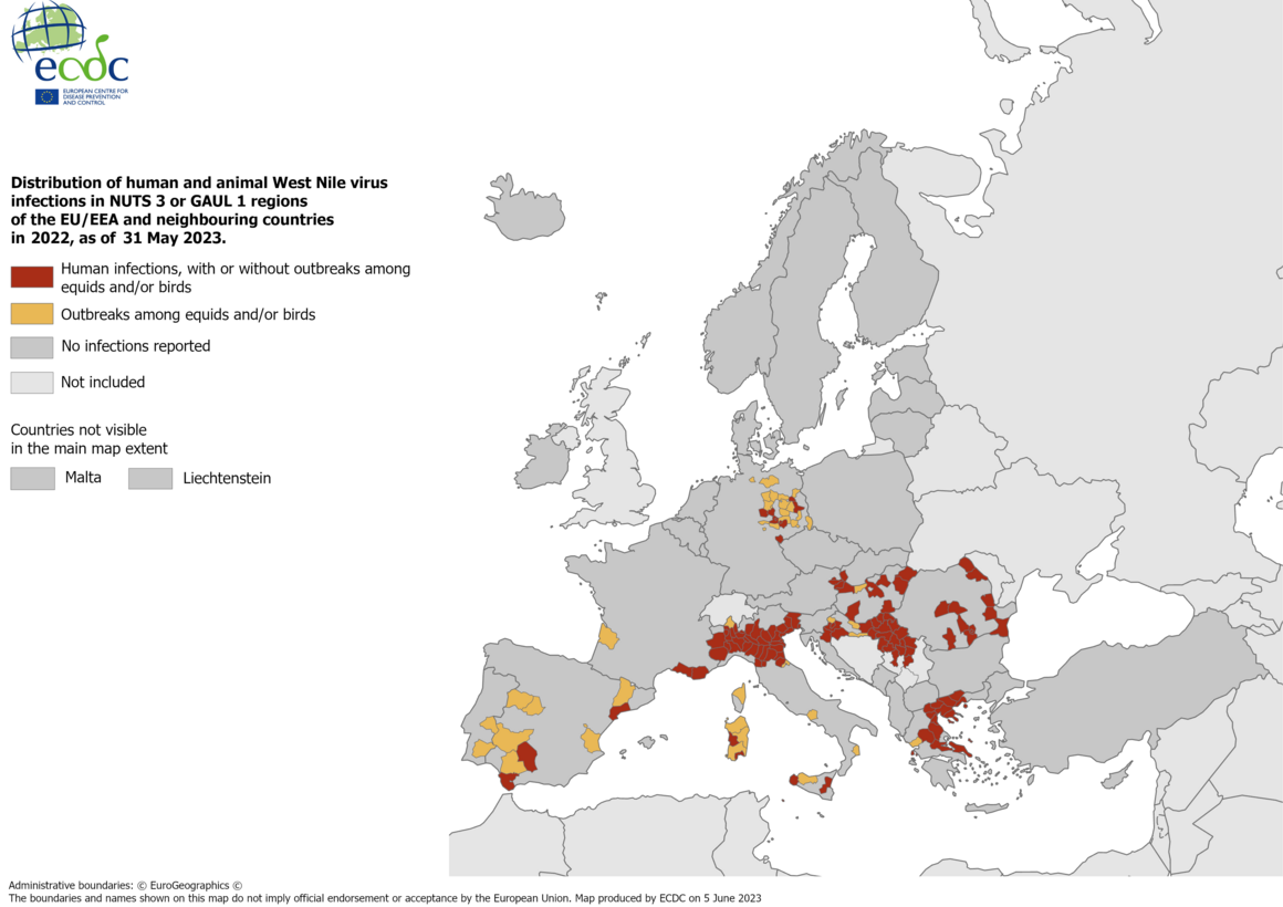As of 30 June 2023, European Union, European Economic Area and EU-neighbouring countries have reported 1 340 locally acquired human cases of West Nile virus infection, including 104 deaths, in 2022.