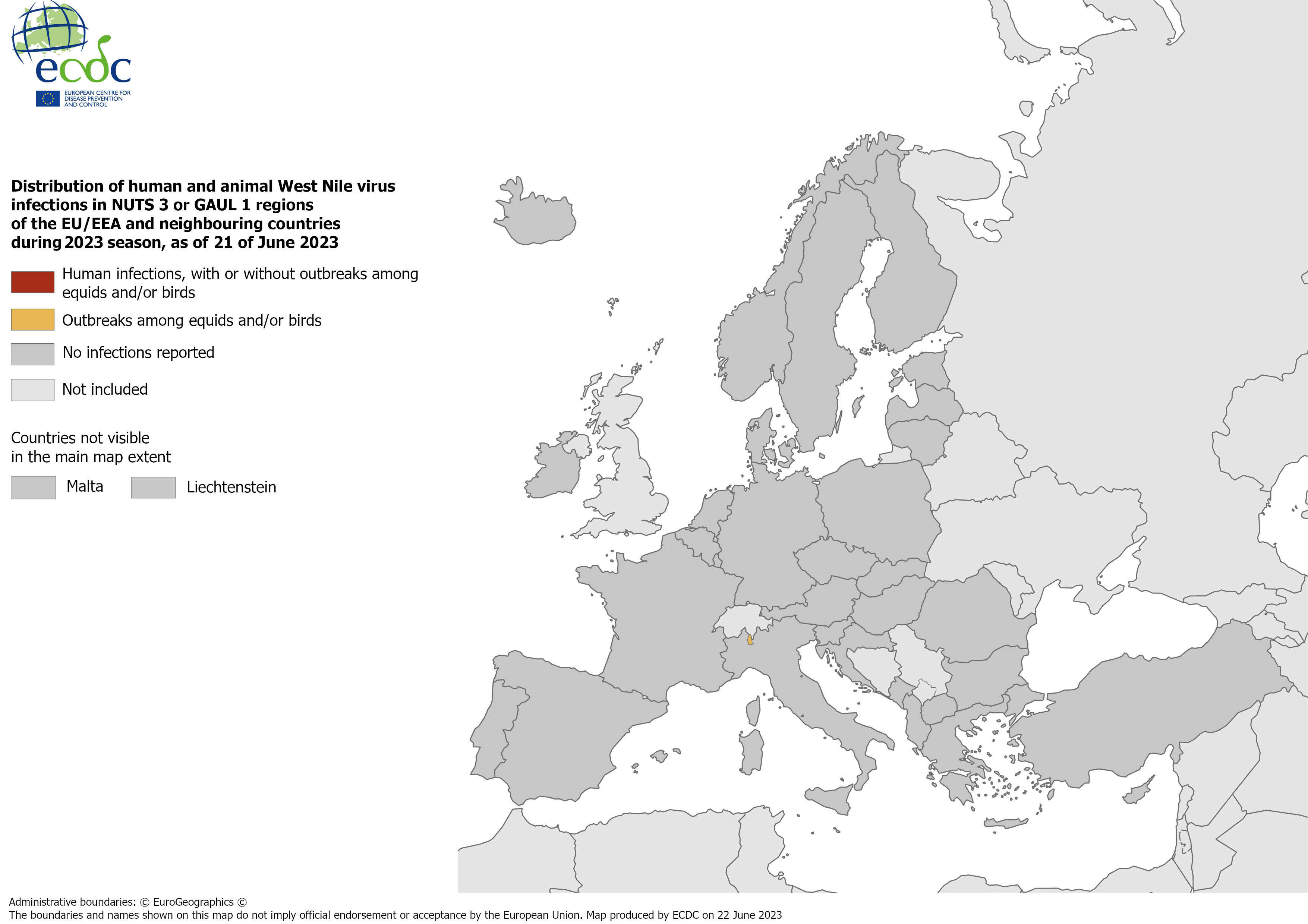 Since the beginning of the 2023 transmission season and as of 21 June 2023, EU/EEA countries have reported no human cases of WNV infection. EU-neighbouring countries also have reported no human cases of WNV infection.