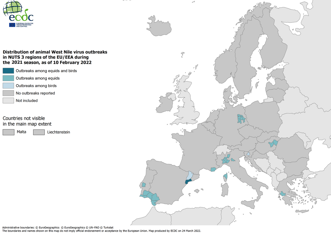 During the 2021 transmission season, 43 outbreaks among equids were reported by EU/ EEA countries through ADIS by Germany (16), Spain (11), Italy (6), Portugal (4), Hungary (3), France (2) and Greece (1). In addition, eight outbreaks among birds were reported through ADIS by Spain (7) and Slovenia (1).