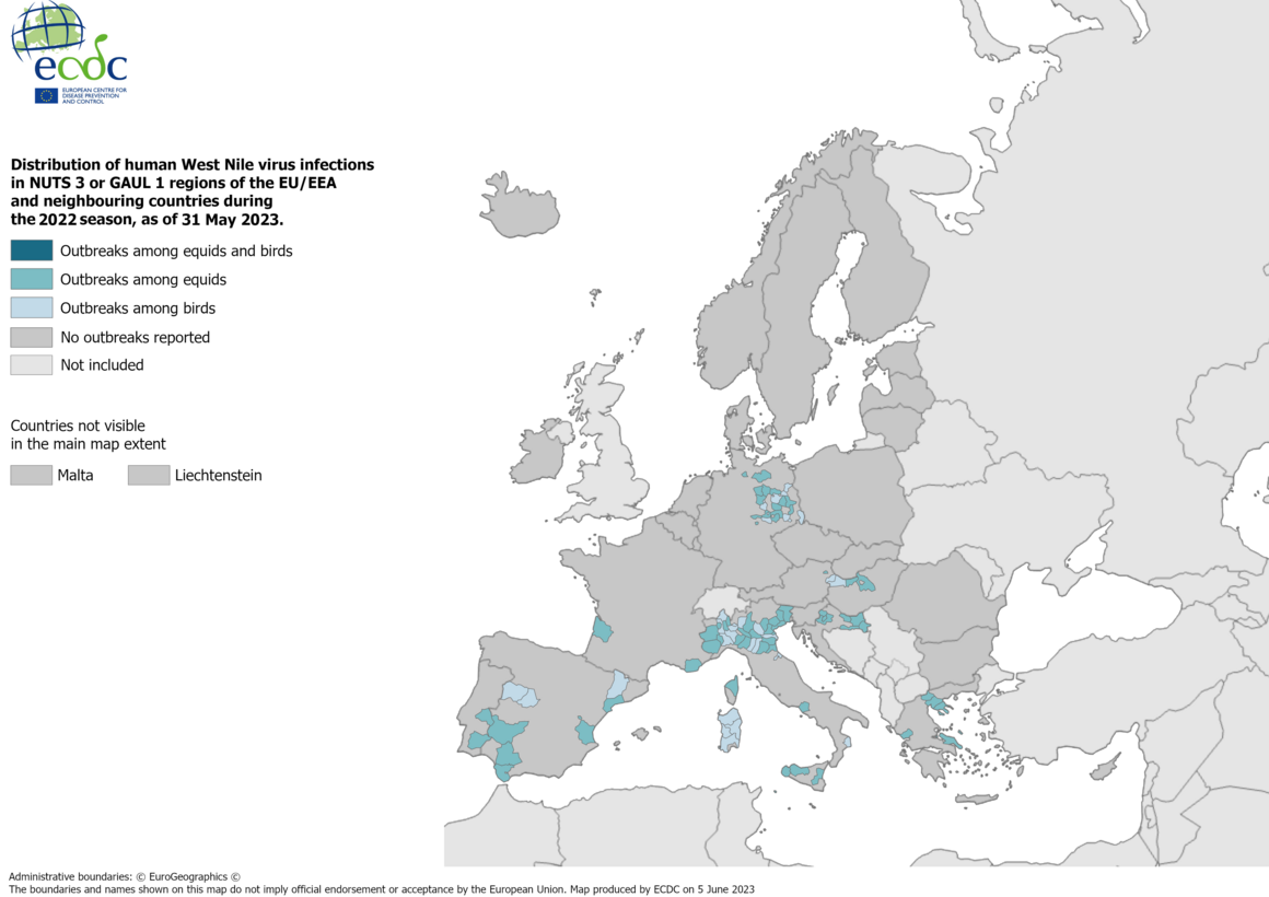 As of 30 June 2023, European Union, European Economic Area and EU-neighbouring countries have reported 1 340 locally acquired human cases of West Nile virus infection, including 104 deaths, in 2022.