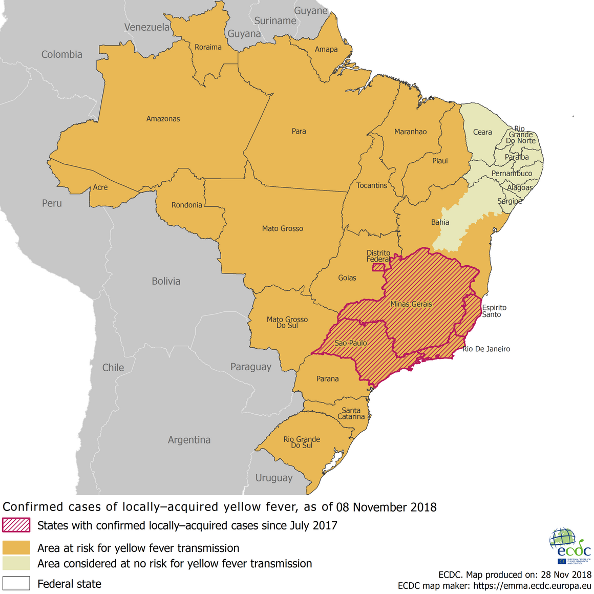 Yellow fever distribution and areas of risk in Brazil as of 28 November 2018