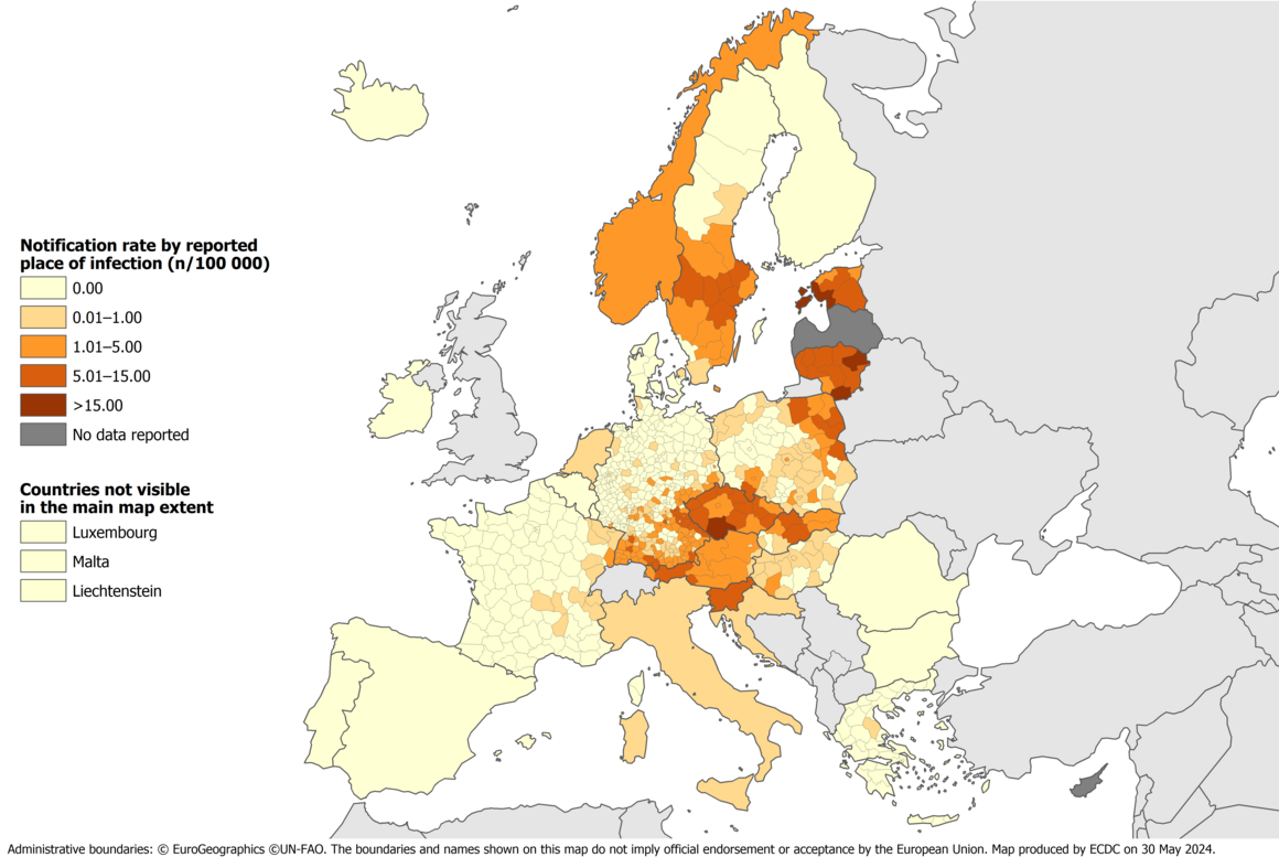 Notification rates of locally-acquired confirmed tick-borne encephalitis (TBE) cases by NUTS region. These visualisations aim to inform public health authorities and EU/EEA citizens about the regional risk of TBE.