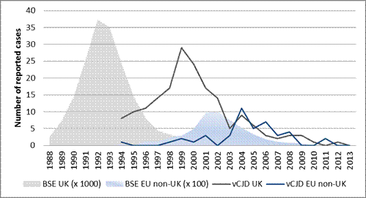 Similarly the trend of BSE cases shows a peak of reported cases in 1992 in UK, followed by a lower peak in 2002 in the other EU countries (EU non-UK) [11]. The time period between peaks of BSE and vCJD cases in the UK is around eight years; while the time period between peaks of BSE and vCJD cases in EU non-UK countries is only two years.